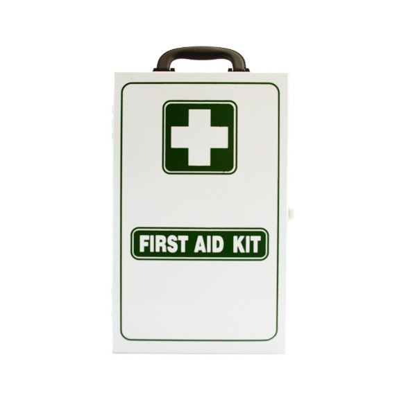 Can be hung on the wall and removed easily to take to the scene of an accident. Can be locked with a small padlock.